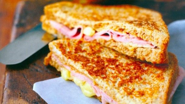 1. Spread two of the slices of bread thinly with the Dijon mustard, if you’re using it that is. Divide the ham and cheese between these slices and top with the remaining slices of bread. Basically, just make a normal ham and cheese. Cut each sandwich into two triangles and you’re finished step 1. Simple enough.