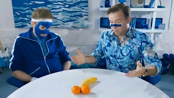 Dermot tries to use a banana and two oranges to explain checking yourself out to Bernard. It doesn’t work.