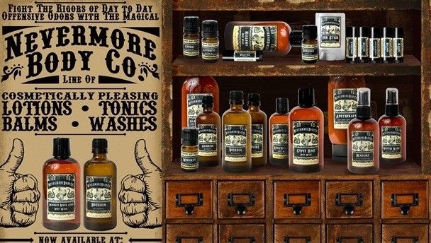 You see the Nevermore Body Company offers containers of skincare products that look like they belong on the shelf of an old apothecary. They also come in man-friendly aromas such as Whiskey and Guinness – if you were looking for girly scents like lavender and rose, you won’t find them here.