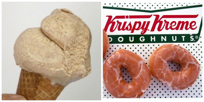 The product consists of a warm original glazed doughnut sliced in half and filled with raspberry gelato and vanilla ice cream.