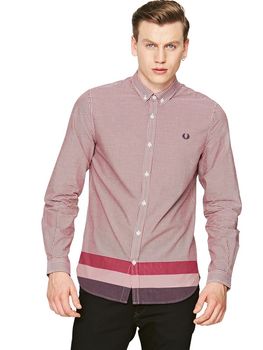 Fred Perry delivers classic tailoring with an eccentric edge with this long sleeve shirt. The gingham check is offset with three bold horizontal stripes to the bottom, giving a powerful, alternative appearance. Button cuffs, gauntlet sleeves and an embroidered Laurel Wreath to the chest provide a timeless finish to this unconventional piece.