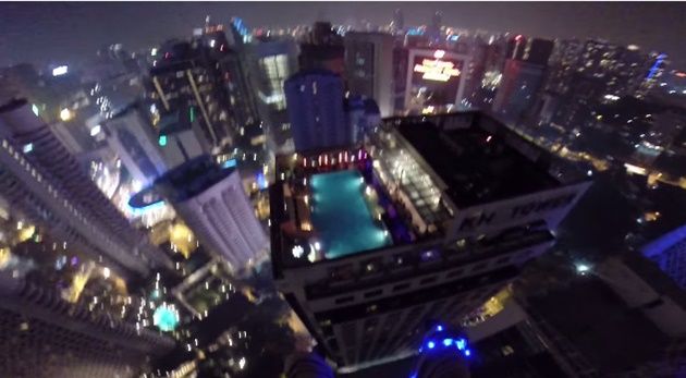 The stunt was attempted on top of Malaysia’s 1100ft-high Kuala Lumpur Tower and the adventurers in question are John Van Horne, Matt Frolich and Andy Lewis.