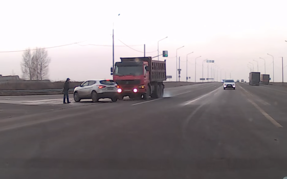 The truck misses the bloke by inches and looking at the damage sustained by the car, a direct impact would have definitely landed the man in hospital… if not the morgue.