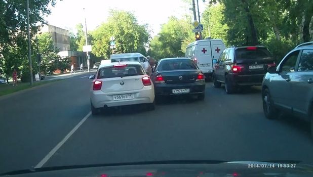 The coldness that the driver of the BMW shows here is pretty scary. A car behind captures a road rage incident in Moscow on Monday where an older Nissan driver gets out to have a word with the driver of the white BMW. Then, as the Nissan driver goes to get back in his car the BMW driver drives straight through him, pinning him between the two cars, leaving him injured on the ground.