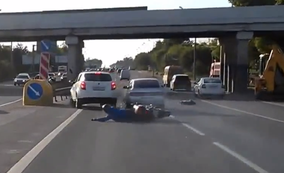 The small white car then crashes into the larger white crossover and it also causes the biker to hit the brakes hard, locking them up and sending him skating across the ground.