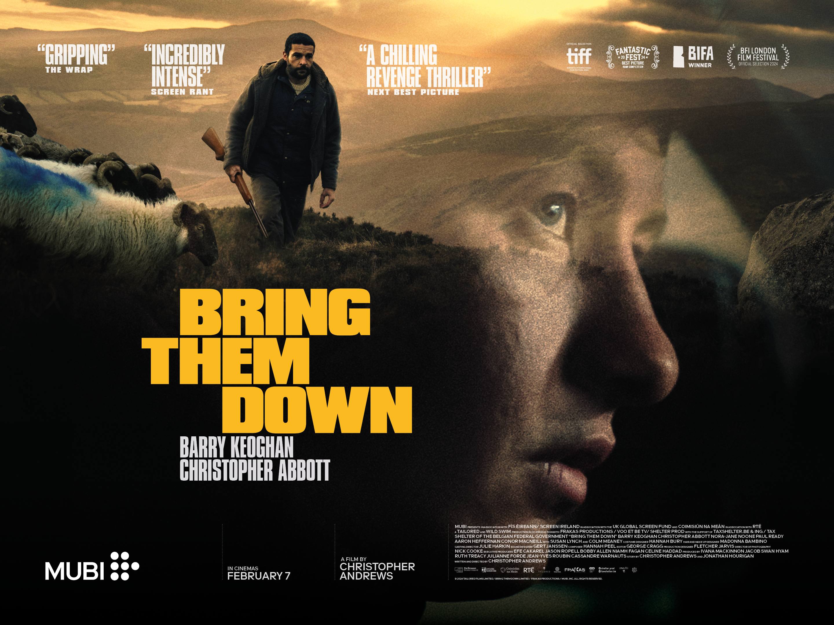 Bring Them Down is a mean-and-lean thriller, full of muscular cat-and-mouse action set-pieces and shocking twists. Rage, and frustration simmer under the surface, as the film evolves with every surprising narrative reveal into a deeply human depiction of long-standing grudges, repressed trauma, and masculinity – all of which play out against the ruggedly beautiful rural Irish landscape.