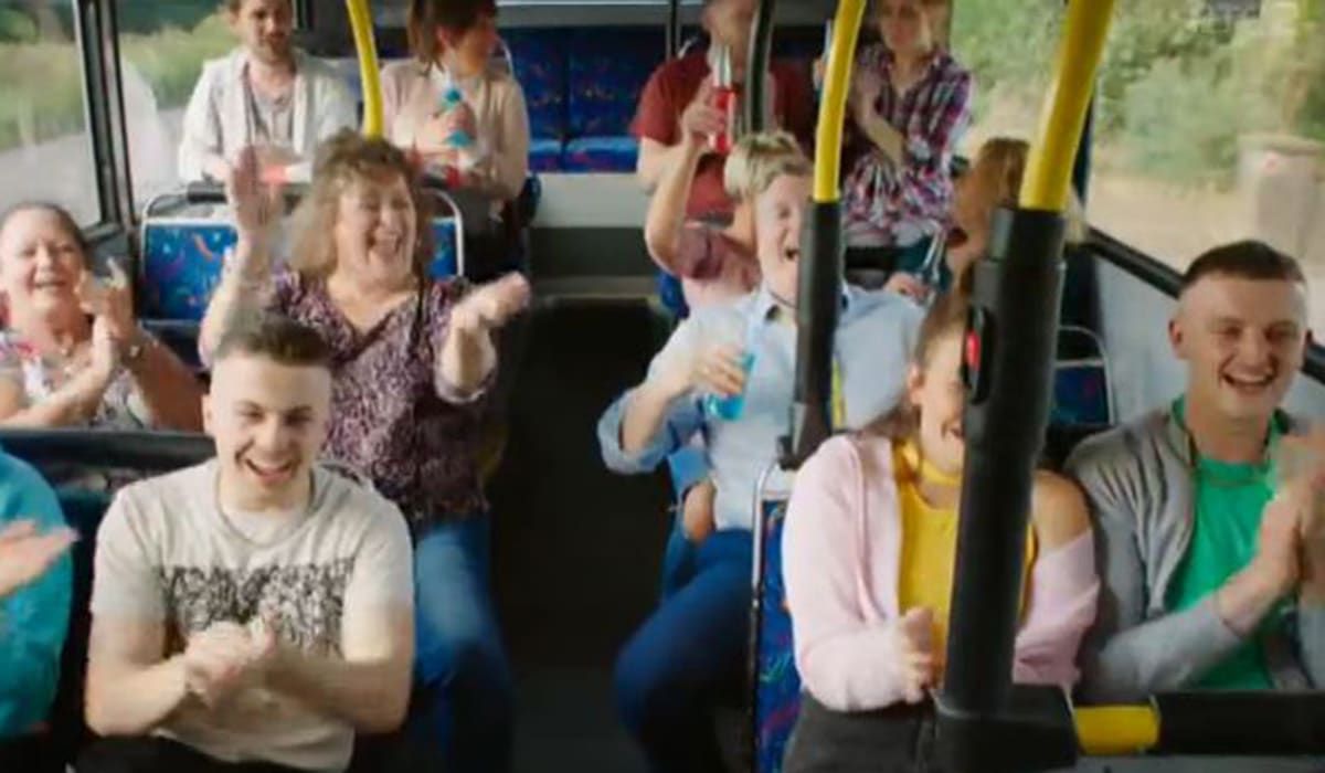 What song does the entire cast sing when they're hijacked on the bus?