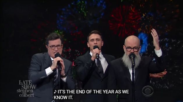 The former REM lead singer joined Stephen Colbert and James Franco for a musical review of 2016, taking in everything from Harambe to Pokemon Go to D***ld T***p.