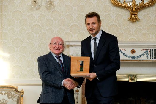 Irish actor Liam Neeson was presented with the Presidential Distinguished Service Award by President Michael D. Higgins in Áras an Uachtaráin on Friday morning.