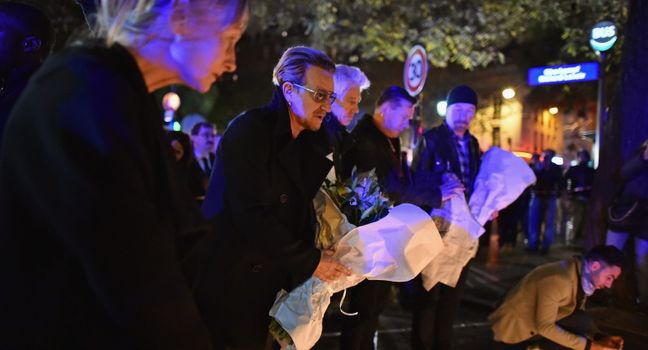 Bono, The Edge, Adam Clayton and Larry Mullen joined with hundreds of people to pay their respects to the dead in the French capital as they laid wreaths, one of which said, “Love to the fans of music, love to the fans of EODM’.