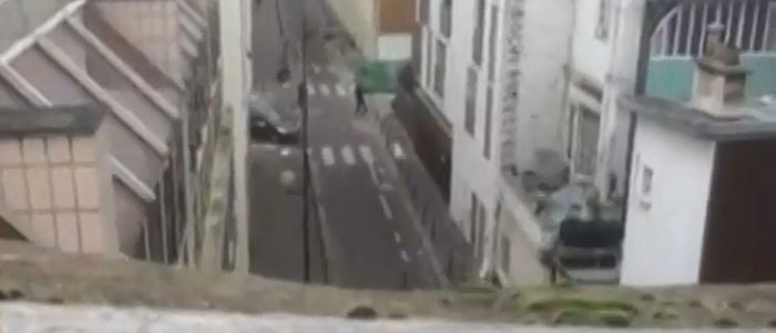 In the footage, which was recorded from a nearby rooftop and published on the France TV website, two men can be seen firing on the Charlie Hebdo offices while those on the rooftop duck for cover.
