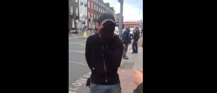 The Irish Times journalist identifies himself in the filming of the video, recorded on Gardiner Street in the capital, but the two individuals who are taking down the posters refuse to do likewise.