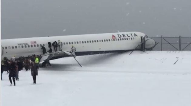 The Big Apple has been suffering a relative snowstorm this morning and as seen in this footage of a Delta MD-88 that landed on the tarmac skidded past the airport fence due to the conditions.