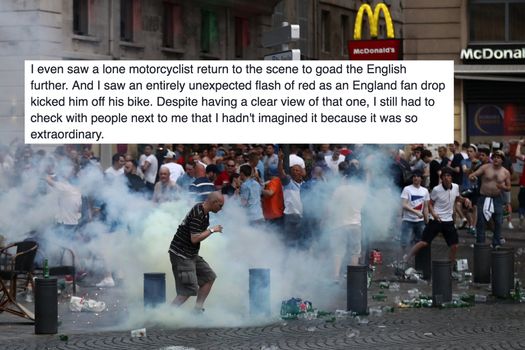 “I even saw a lone motorcyclist return to the scene to goad the English further. And I saw an entirely unexpected flash of red as an England fan drop kicked him off his bike. Despite having a clear view of that one, I still had to check with people next to me that I hadn’t imagined it because it was so extraordinary.”