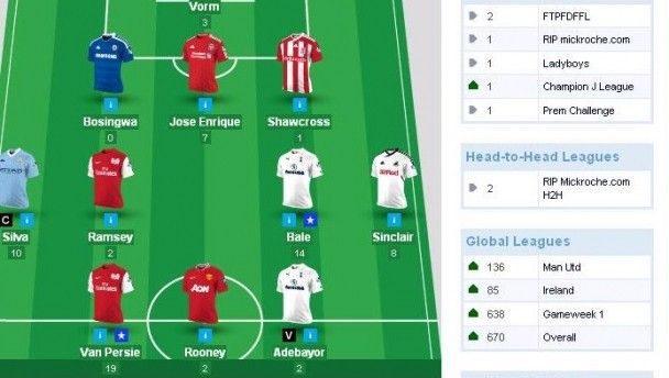 Continuing the eerie coincidences, both Neil and Alan scored 68 points this week and the highest scorer on both sides was Robin van Persie with 19 points. Conell Cashell outscored both of the top dogs with an impressive 77 points, while the rest of the top five is populated by Joe Culloty’s Stopfeedingtheyak and Man Shity, the invention of the foul-mouthed if admittedly hilarious Joe McGeary.