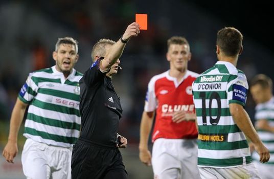 The Dublin Derby tonight in Tallaght was a pretty stormy affair. Shamrock Rovers and St Pat’s shared four goals, two penalties and two red cards but all the positive stuff (the goals and the penalties) were for the Inchicore men while all the misery (red cards) went to Rovers.