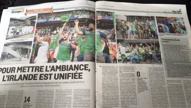 The daily French sports paper L’Equipe has dedicated two pages in celebration of the Irish fans and what they’ve brought to the tournament.
