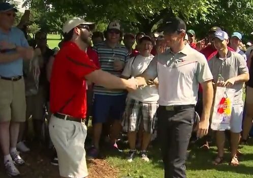 Yesterday we showed you a Vine of Rory McIlroy embracing a spectator after a wayward tee shot on the 14th at the Tour Championship landed in the fan’s pocket after bouncing off a tree.