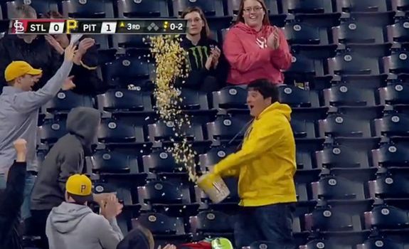 Ah, the sweet, sweet taste of delicious, baseball-flavoured popcorn. While attending the recent MLB game between St. Louis Cardinals and Pittsburgh Pirates, one baseball fan defied the founding teachings of the game by refusing to use a baseball glove – or a beer cup for that matter – to catch a foul ball flying towards him, instead relying on his family-sized vat of popcorn to help him get the job done.