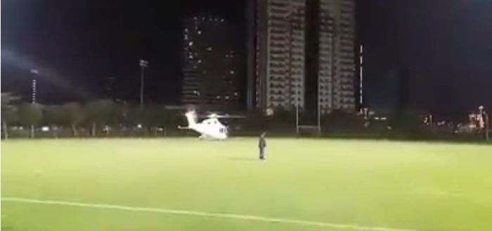 We’ve heard of training being delayed because of a bad injury, half the team hasn’t showed up, someone forgot to pay for the floodlights, but a halt in play because of a helicopter landing? We don’t think we’ve ever heard or seen the likes.