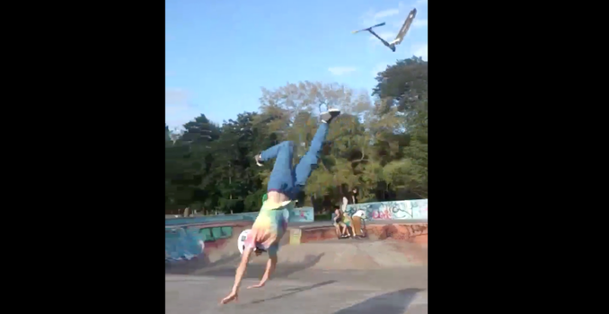 One poor soul in Waterford City People’s Park had a nasty run in with a skatepark today when he attempted to land an audacious flip on a scooter.