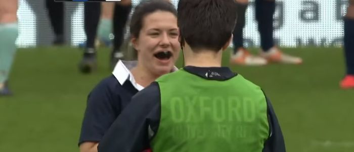 Her side were 40-0 down against big rivals Cambridge when she dislocated her finger and was instructed by the referee to get it sorted by the physio.