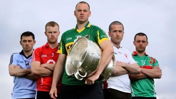 Raring to go! Dublin’s Alan Brogan, Michael Shields of Cork, Kerry’s Michael Quirke, Tyrone man Stephen O’Neill and Mayo skipper Trevor Mortimer at the launch of the GAA Senior Football Championship in Kerry yesterday.