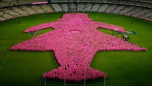 Participants form the ‘Field of Women’ to raise funds for Breast Cancer Network Australia before the round seven AFL match between the Melbourne Demons and the Western Bulldogs at Melbourne Cricket Ground today.