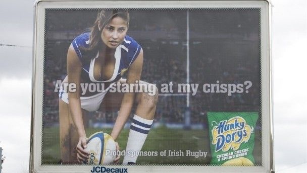 The Irish Examiner reveals Hunky Dorys has been banned from using the controversial posters of scantily clad models in rugby gear. The crisp producers have been accused of using sexist ads to promote their products.