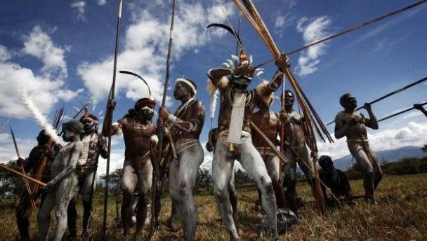 Papuanese tribal men stand with their traditional armament during the Baliem Valley Festival on 9 August in Wamena, Indonesia. The Dani, Yali and Lani tribes gather at this annual festival each dressed in distinctive tribal attire, stage mock battles, perform traditional music and dance, and celebrate with a pig feast.