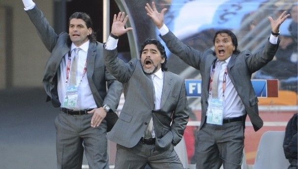 Argentina coach Diego Maradona (centre) and his staff react during their World Cup Group B win against South Korea today at Soccer City Stadium in Jo-burg.