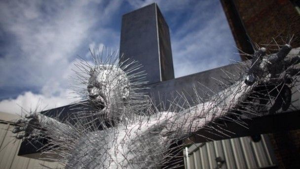 A view of artist David Mach’s sculpture ‘Die Harder’, at his workshop in London, England. The piece depicting Christ on a cross, is made from 3,000 coat hangers and forms part of a four-year-long project by the artist to mark the 400th anniversary of the King James Bible in 2011. It is due to be installed inside Gloucester Cathedral where it will hang along with other sculptures from renowned artists including Damien Hirst and Marc Quinn as part of the ‘Crucible’ exhibition.