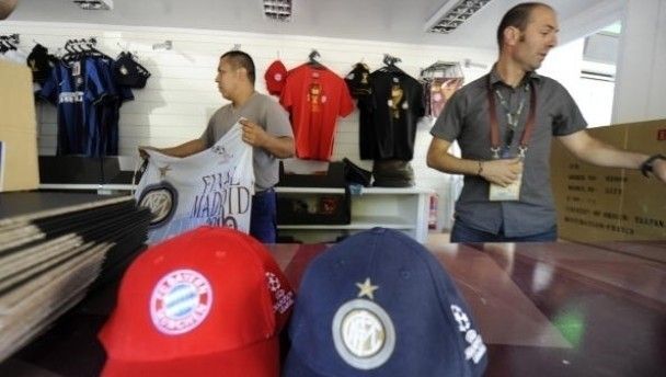 Sellers display Bayern Munich and Inter Milan shirts, caps and flags for sale at Santiago Bernabeu stadium in Madrid on 21 May, 2010 ahead of the UEFA Champions League final between the two sides tomorrow night.