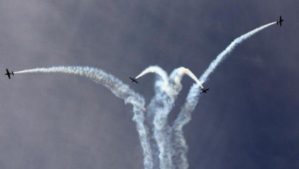 The Blades flying display team at yesterday’s Farnborough Airshow in Farnborough, England. The airshow is one of the biggest of its kind and though it traditionally features announcements of military jet orders, the recent slashing of government defence budgets has reduced the proliferation of such deals at current and future air shows.