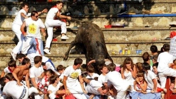 The beast jumped a barrier in the stadium and rampaged through the crowd. 30 were injured before the bull was finally pinned down by the crowd and dispatched with the aid of a forklift.