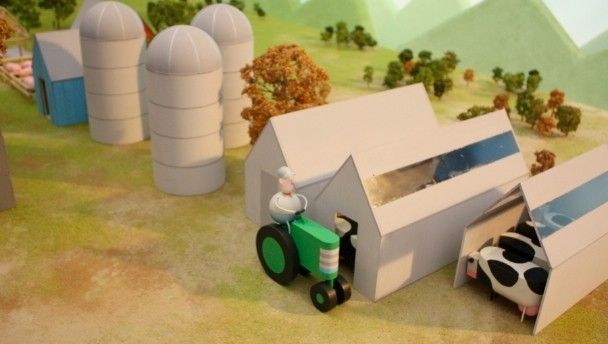 The video depicts the life of a farmer as he slowly transforms his family run farm into an industrial animal factory where pigs are pumped full of medicine, testosterone and God knows what else. The farmer sees his world changing before his very eyes and eventually sees the errors of his ways. The farmer then opts for a more sustainable future at it all ends rosy for everyone involved – except the pigs, of course.