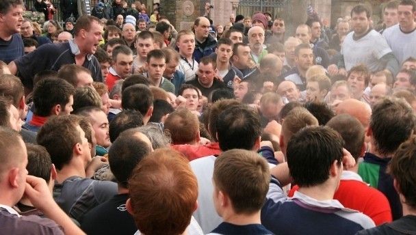 In the current version played every year, the town’s men folk are split between the ‘Doonies’ and the ‘Uppies’. A small leather ball is thrown between a scrum made up of the two teams, several hundred men strong, and the Doonies try to push the ball into the sea while the Uppies try to get it to a wall one mile up the town.