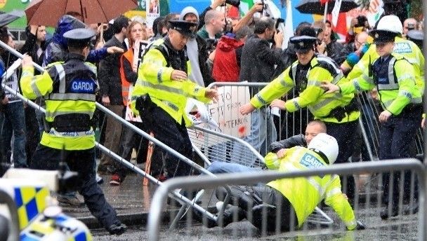 Four people were arrested after clashes with Gardai amid rainy scenes. Eggs, bottles and shoes were thrown at Blair, although none hit the former PM.