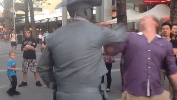 Street performers have to stand still in the cold for hours on end just to make a few quid, so you can understand why this performer punched a douchebag onlooker in the face.