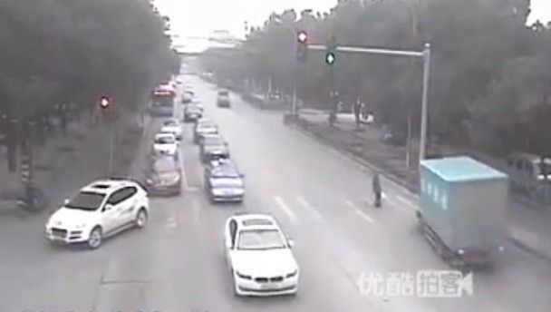 Here we see a dumbass pedestrian who just walks out into the middle of a busy road and causes a truck to swerve into a traffic light. The video itself comes from China, the jaywalking capital of the world, as it would seem (after Russia).