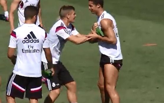 German international Kroos seems to be settling in well judging by the above clip of a passing exercise at Real Madrid training, where he dictates the tempo and direction of the play while a frustrated Cristiano Ronaldo is left chasing shadows in the middle.