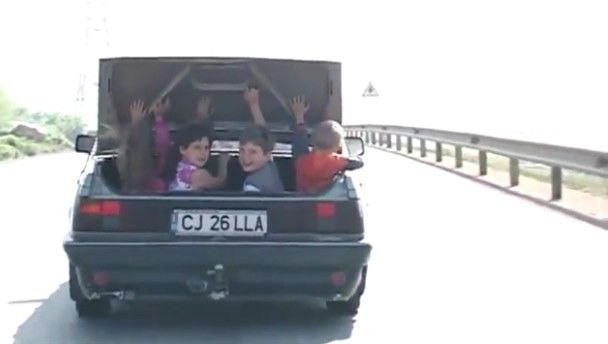 Here we have a sickening video that shows a Romanian driver risking his kids’ lives by sticking them in the boot and making them hold up the lid.