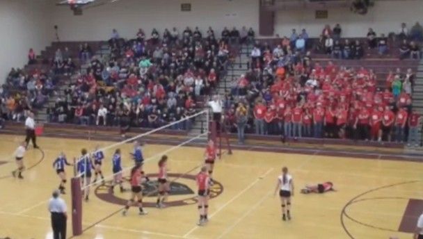 At this high school volleyball game in Iowa, a player from Holy Trinity Catholic school manages to kill to birds with one volleyball as she knocks over one of the opposing team’s players and also a fan in one fell swoop.