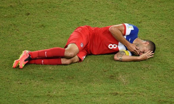 In an entirely accidental clash, USA goalscorer Clint Dempsey took a kick in the face from Ghana defender John Boye.