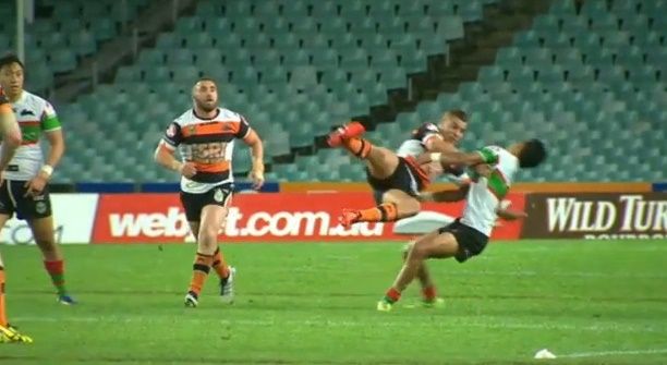 Wests Tigers under-20’s forward Tyler Cassel is in some hot water with Australian Rugby League authorities after this vicious tackle on Rabbitohs fullback Devon Makoate-Boyce last Friday night.