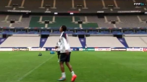 Raphael Varane footballs the blazes out of this football as he kills a long range pass in training before sending it back from whence it came during French training.