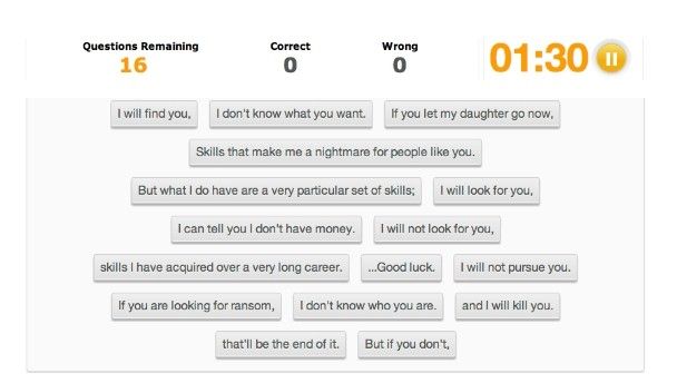Take the ‘Taken’ quiz for example (pictured above). We all know the famous quote from the movie, right? “I will find you… and I will kill you”. Well, one of the many games on Sporcle tests your ‘Taken’ knowledge to see if you know exactly what Liam Neeson says. Chances are, you won’t. Have a go here.